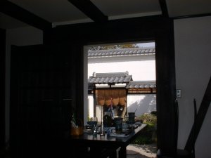 | 少し横丁に入ったところに、土蔵を改良した素敵な喫茶店がありました。2階はギャラリー。写真は部屋の中から入り口の門を見た様子です。 |
