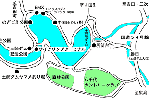 土師ダムレポート 中国自動車道千代田インターを下車、最初の交差点を右折(東)します。土師ダム(八千代湖)までは一本道です。ダムが見え始めてしばらく走ると、向こう側に渡る橋が見えます。この公園は、アジア大会の時に整備されました八千代湖の魅力は、さくら、ふじ、アジサイ、コスモス、などが季節を追って次々に咲き乱れます。また、湖周辺は動物・植物にとって良好な生息環境となっており、ウグイス、マガモ、ヨツガモなどが観察できます。 地図: