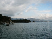 | 桟橋まで2.1Km包ケ浦まで0.8Km | 向こうに見えるのは安芸小富士 | 包ケ浦の桟橋です |