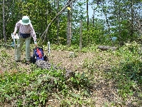 | 登山口の林道が見えてきました。 | 下山終点手前の炭焼き跡(煙突) | 下山終点手前の炭焼き跡(窯) |