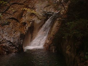 寂地峡レポート 山口県下では最高峰の寂地山(1,337m)に源を発する宇佐川の上流に、18からなる滝をもった犬戻峡と呼ぶ峡谷があり、約3.5qにわたっいる。また、その下流には同じく寂地山系に源をもつ河流があってこれと合流するが、この約1qにわたる河流域を龍ヶ岳峡と呼ぶ。寂地峡はこの両峡谷を総称するものである。この一帯は、中世代に貫入した花崗岩類からなるが、これを切る宇佐川は、大小さまざまの深い淵や滝、節理状に直立する断崖絶壁など特異な景観を展開している。また、渓流と岩壁が樹木の美しさと相まって全くの幽遠境を形成している(錦町教育委員会HPより) 山口県玖珂郡錦町 2000年9月 |