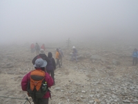 霧で山道の先が見えません。 | 植生保護のために登山路の両側にロープが張ってあるので迷うことはありません。 |