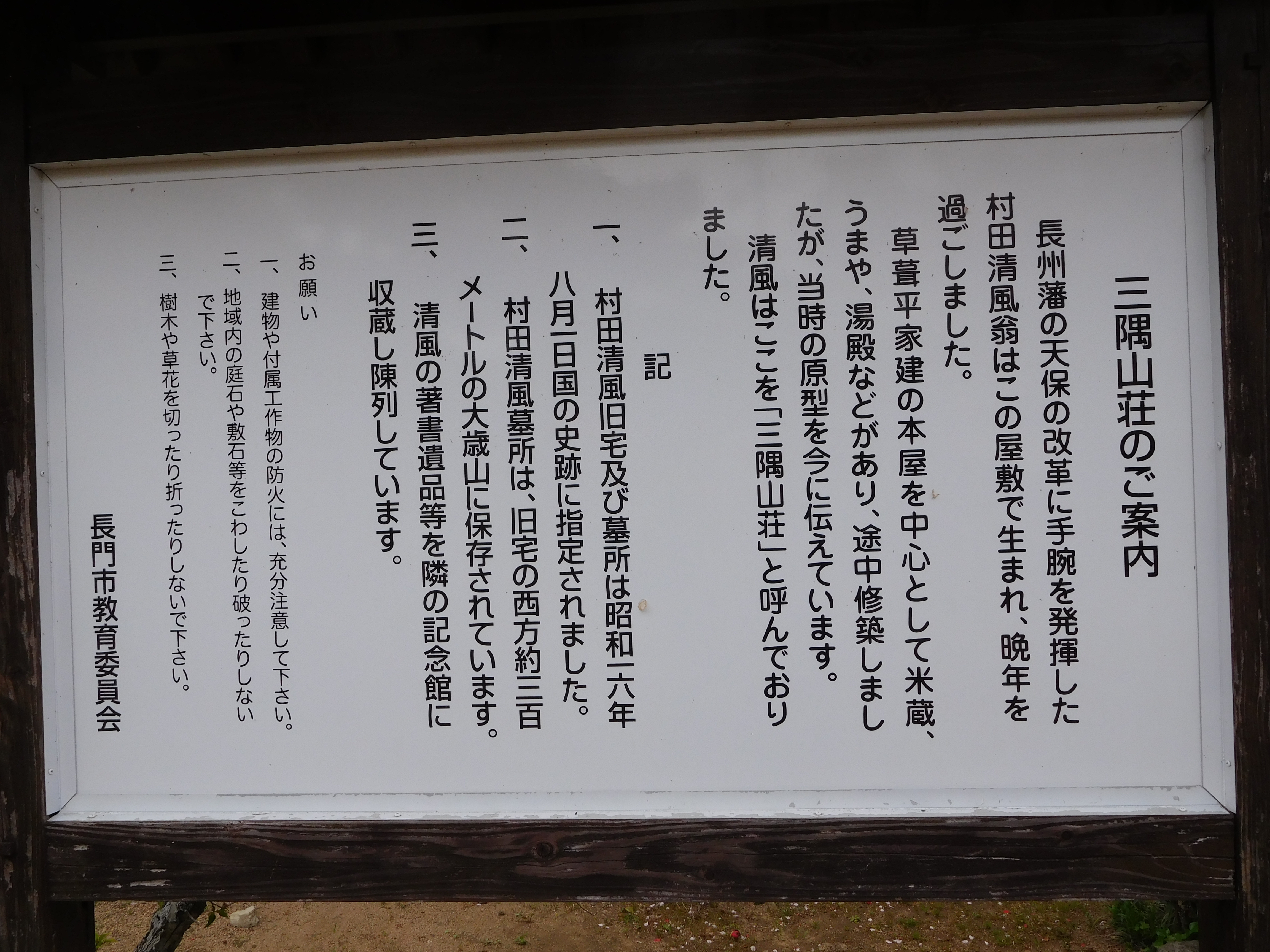 今回の訪問で初めて訪れたのが「村田清風記念館」です。その名前を知ったのがこの訪問が最初でした。村田清風は藩主毛利敬親に抜擢登用されて長州藩天保改革の第一人者として活躍した。財政に明るく五人の藩主につかえて50年、行政官の超先達であり、その抱負、学識の深さは時代を超えていた。清風が期待した周布政之助が藩政改革を継承し、さらに吉田松陰、高杉晋作、木戸孝允と輩出する長州藩制改革新派の言動力と成った。 |